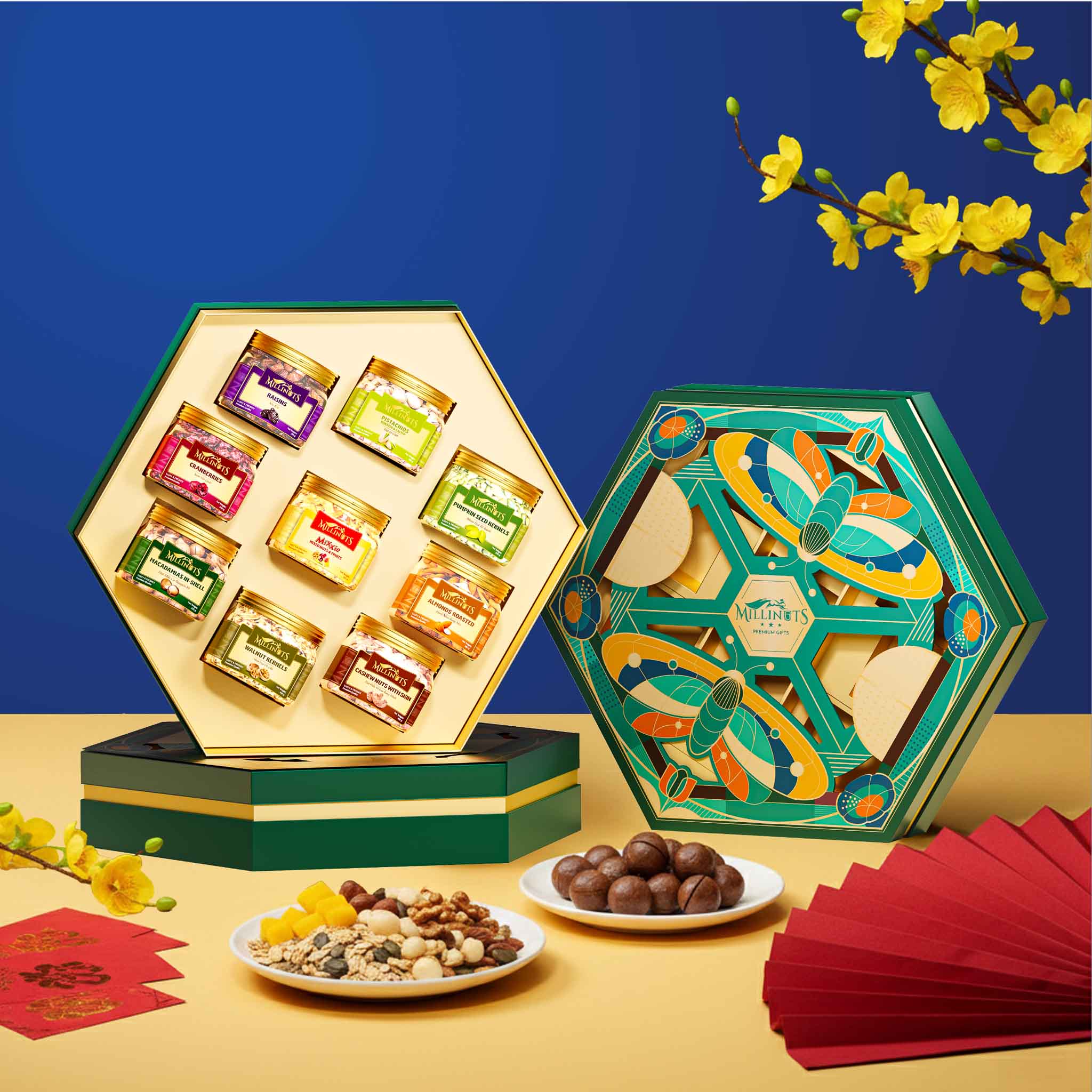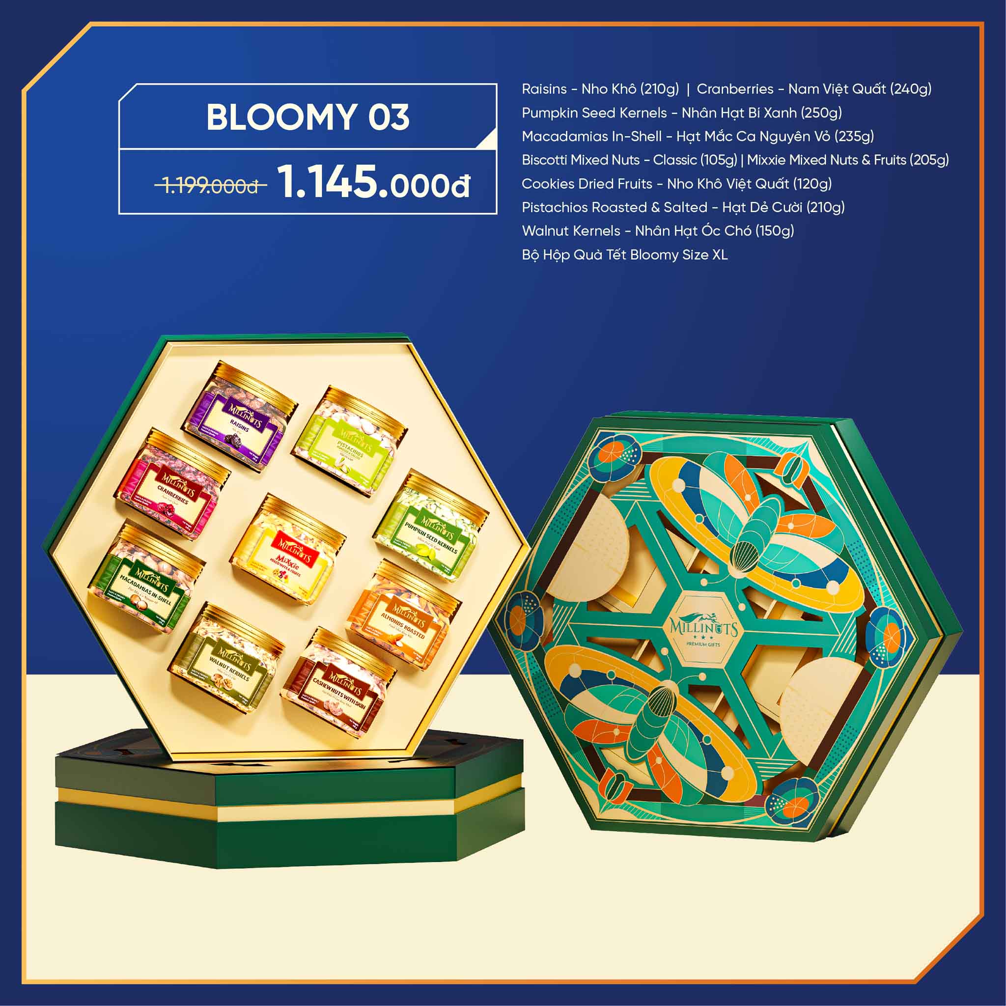 Tất cả 9 sản phẩm trên đều được sắp đặt gọn gàng trong hộp Bloomy Size XL nổi bật với thiết kế hình lục giác. Họa tiết hoa xuân và cánh bướm khắc họa tinh tế trên nắp hộp, tượng trưng cho sự khởi đầu mới, tinh thần đổi thay và phát triển trong năm mới. Tông màu xanh ngọc phối cam đất và vàng ánh kim tạo nên tổng thể hài hòa, sang trọng nhưng không phô trương. Dù là biếu sếp, khách hàng hay người thân, hộp quà vẫn toát lên vẻ trang nhã, chỉn chu và đầy thiện cảm.
