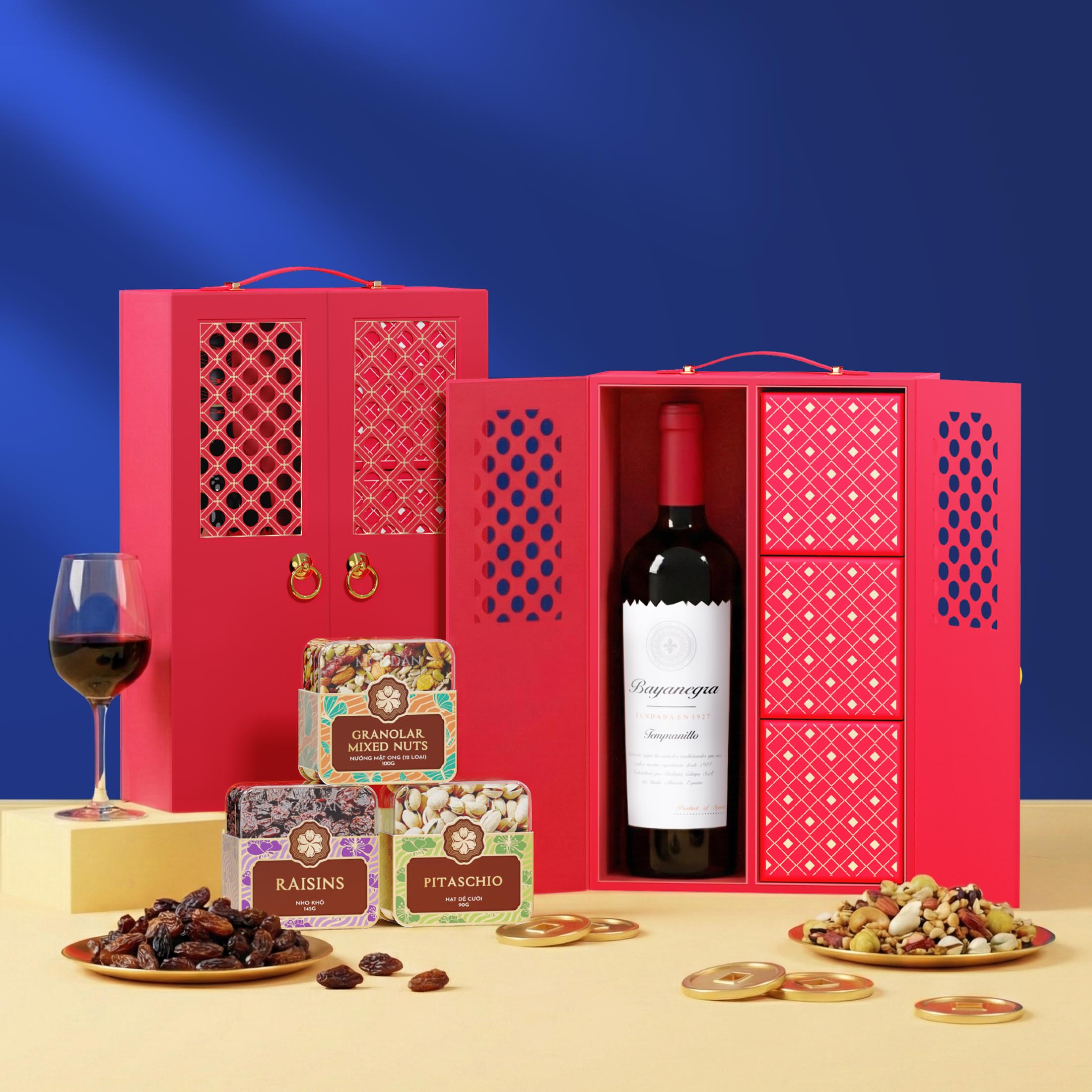 Nâng tầm nghệ thuật tặng quà với combo Deluxe 01, sự kết hợp hoàn hảo rượu vang hảo hạng và các loại hạt tuyển chọn. Không chỉ là một món quà, đây là lời chúc thịnh vượng, là tâm ý trân trọng được gói ghém trong sắc đỏ may mắn, sẵn sàng chinh phục những người nhận tinh tế nhất.