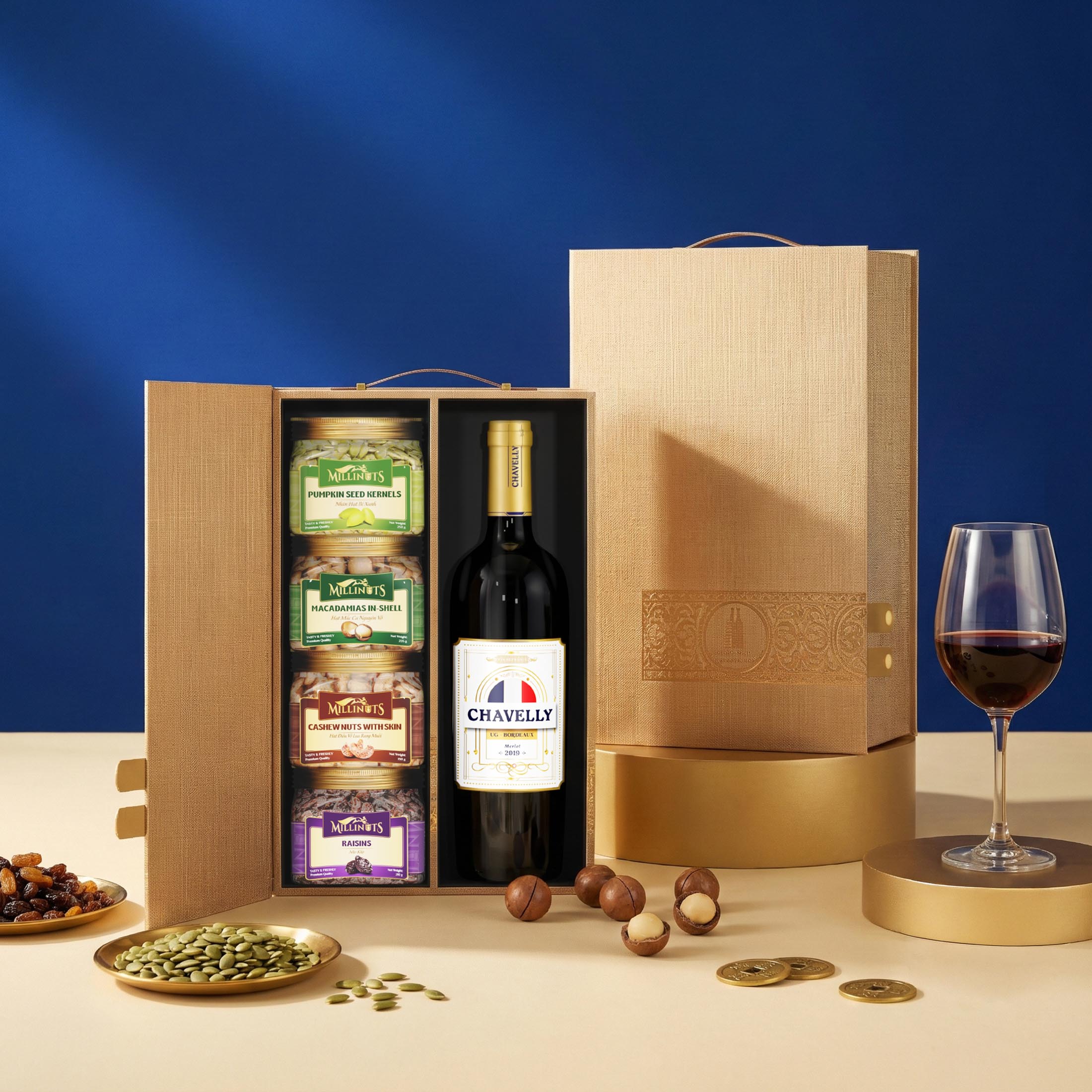 Sở hữu thiết kế hộp da màu nâu ánh vàng, sang trọng và hiện đại, combo Deluxe 05 là lựa chọn lý tưởng cho các dịp biếu tặng trang trọng như Tết doanh nghiệp, tri ân khách hàng, người thân. Bên trong hộp là sự kết hợp hài hòa giữa hạt dinh dưỡng – bánh quy cao cấp – trái cây sấy – vang đỏ Pháp, mang thông điệp sức khỏe, sum vầy và thịnh vượng đầu xuân.