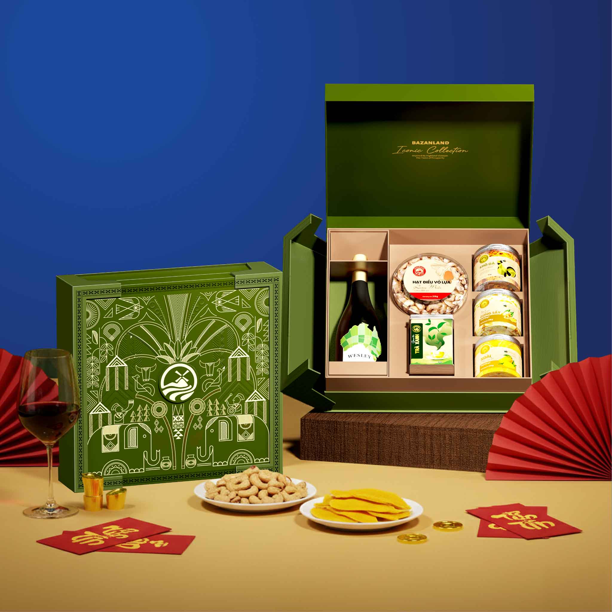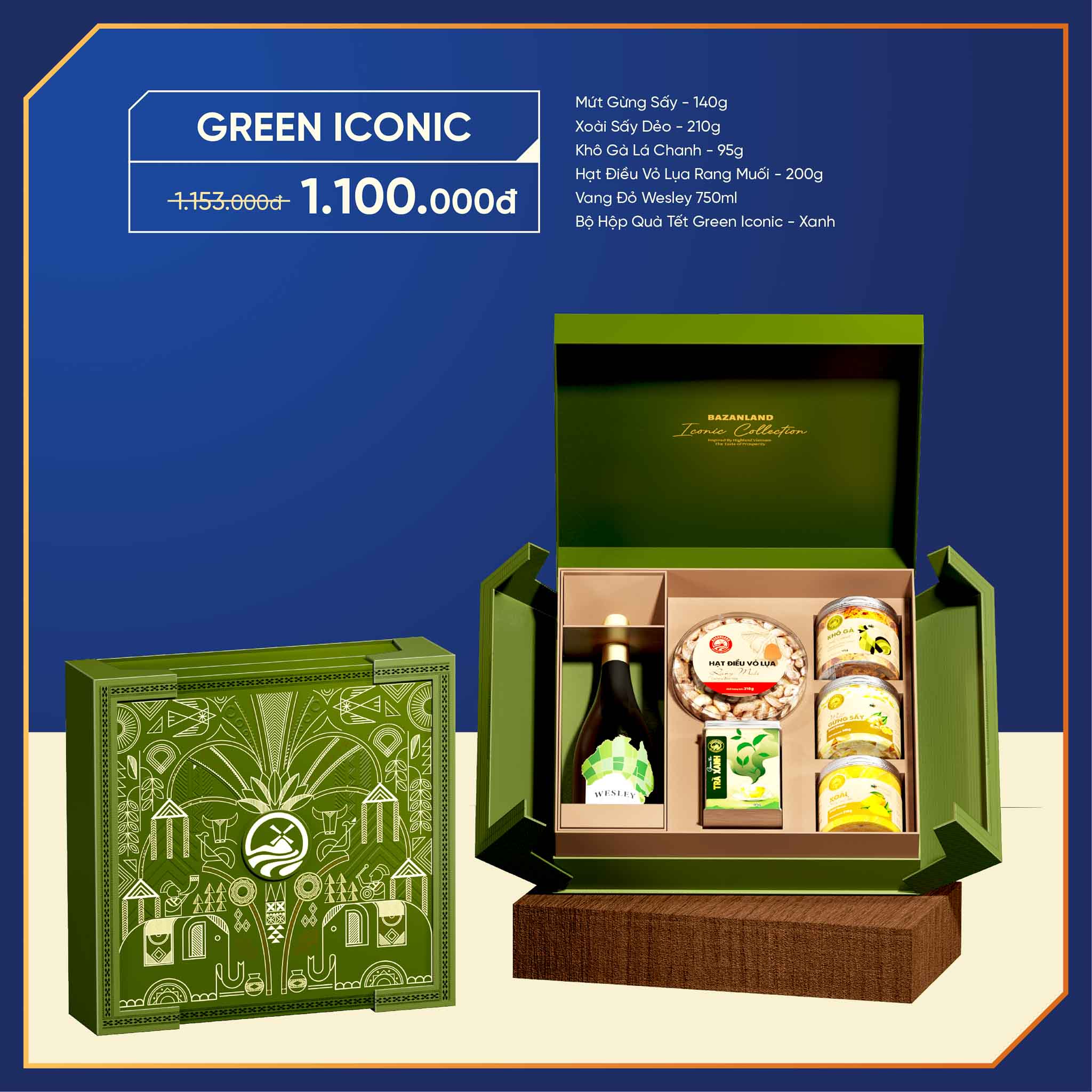 Combo Green Iconic là lựa chọn quà Tết dành cho những ai yêu thích vẻ đẹp trầm lắng, bền vững và giàu ý nghĩa biểu tượng. Lấy cảm hứng từ sắc xanh của thiên nhiên và những họa tiết văn hóa cách điệu, bộ quà không chỉ gây ấn tượng bằng thiết kế nghệ thuật mà còn chinh phục người nhận nhờ sự kết hợp hài hòa giữa nông sản sấy nhiệt đới, hạt dinh dưỡng và rượu vang đỏ đẳng cấp.