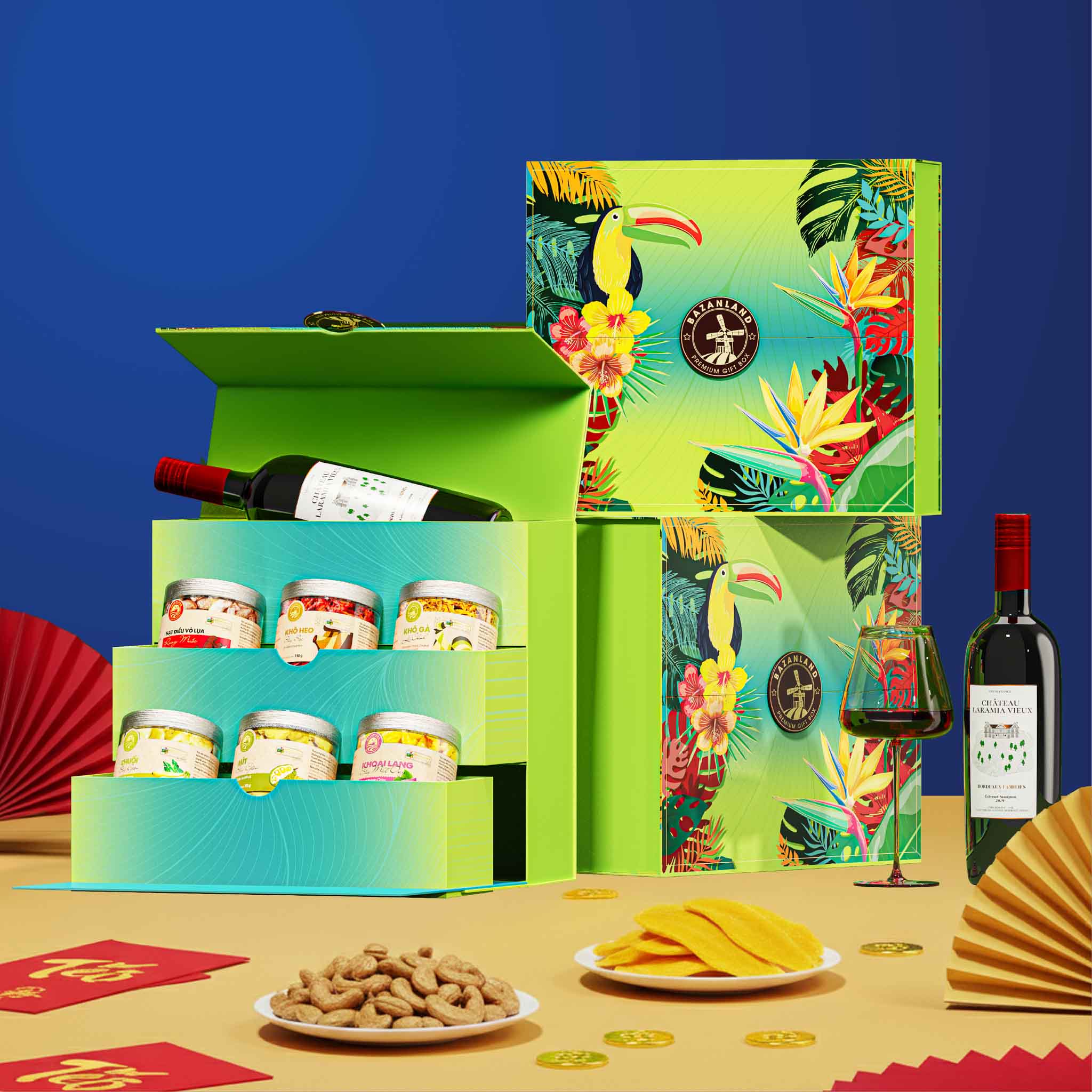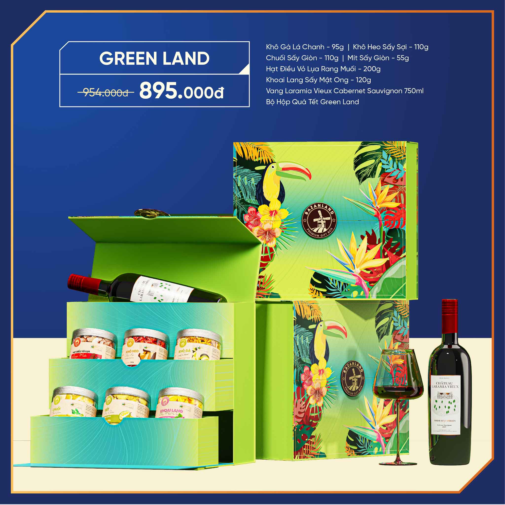 Combo Green Land mang đến một làn gió Tết hoàn toàn mới với thiết kế hộp lấy cảm hứng từ khu rừng nhiệt đới rực rỡ sắc màu. Hình ảnh chim muông, hoa lá phương Nam kết hợp cùng gam xanh mát mắt tạo nên tổng thể sinh động, trẻ trung nhưng vẫn tinh tế. Mỗi chi tiết đều gợi cảm giác tươi mới, năng động và tràn đầy sức sống – như một lời chúc khởi đầu hứng khởi cho năm mới.
