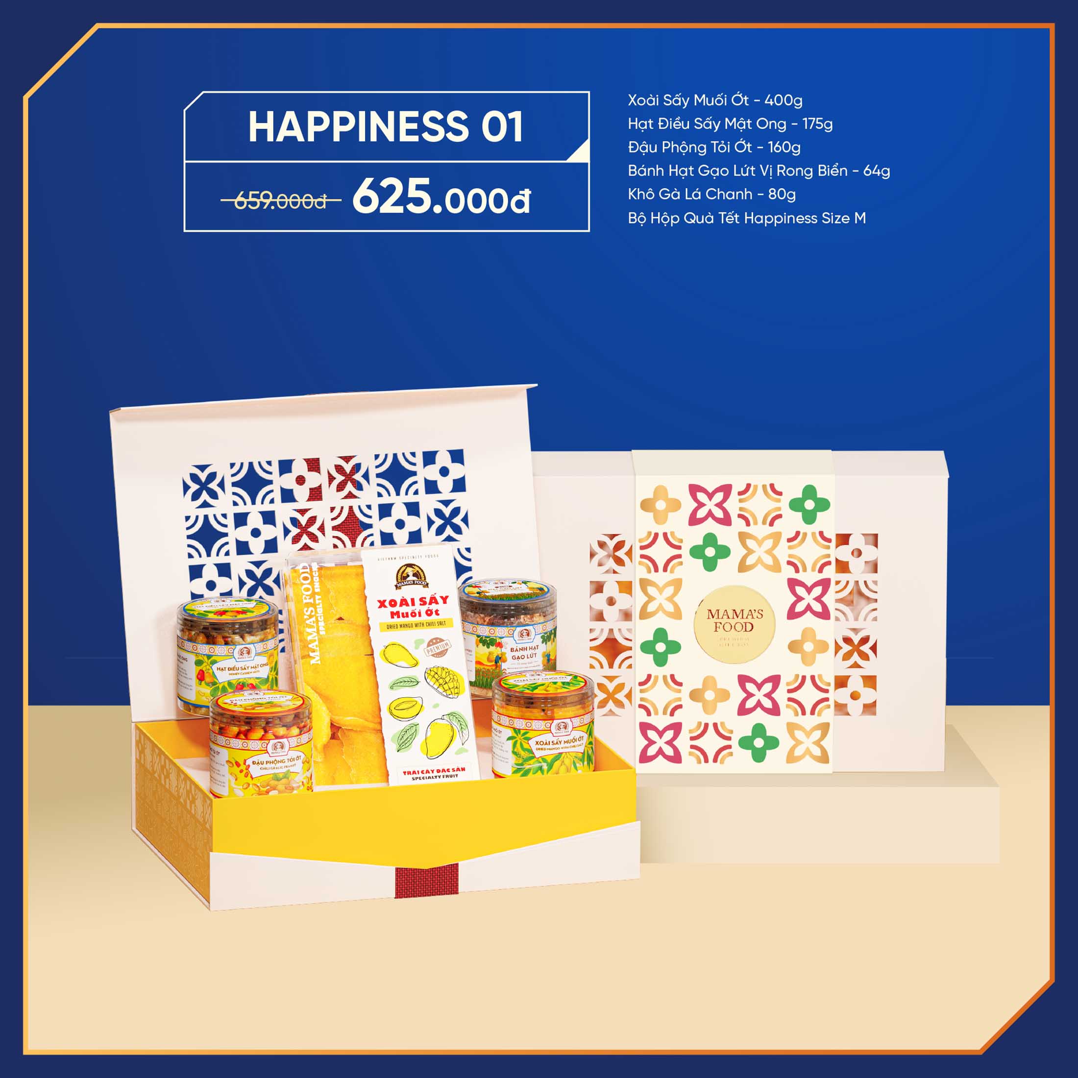 Không đi theo lối mòn của những giỏ quà cồng kềnh, combo Happiness 01 chọn lối đi riêng với phong cách tinh tế, gọn gàng và có gu. Bộ quà quy tụ những món ăn vặt quen thuộc, hợp khẩu vị số đông được sắp xếp khéo léo. Đây là giải pháp quà tặng Tết lý tưởng, vừa vặn túi tiền cho doanh nghiệp, gia đình muốn tặng quà chỉn chu nhưng không quá cầu kỳ.