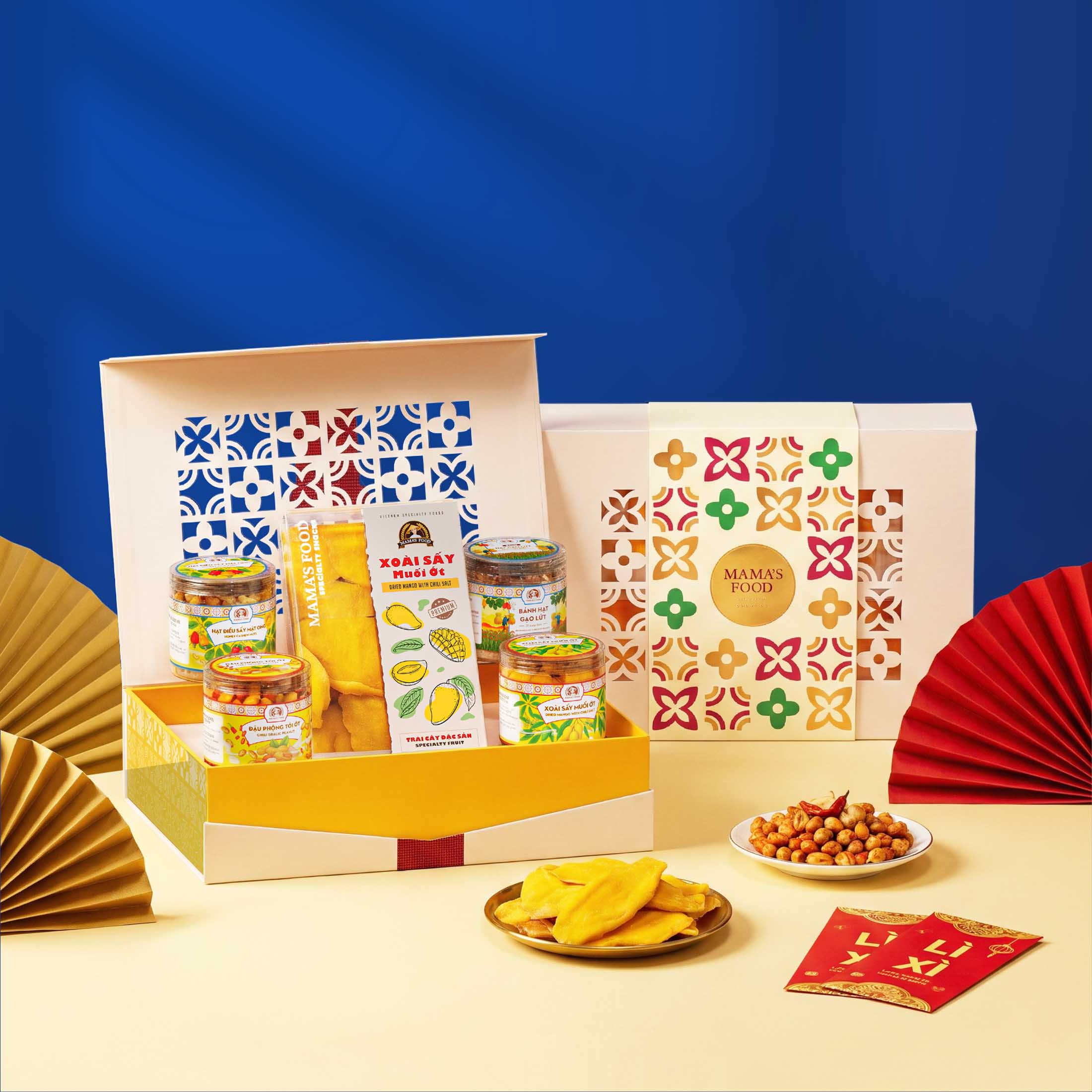 Tất cả được sắp xếp ngay ngắn trong hộp quà Tết Happiness Size M thiết kế tinh giản nhưng nổi bật. Hộp sử dụng tông màu Tết tươi sáng, họa tiết trang trí hiện đại, tạo cảm giác vui vẻ và thân thiện ngay từ cái nhìn đầu tiên. Kích thước hộp vừa tay, dễ cầm, thuận tiện cho việc biếu tặng trực tiếp hoặc vận chuyển số lượng lớn mà vẫn giữ được sự chỉn chu cần thiết.