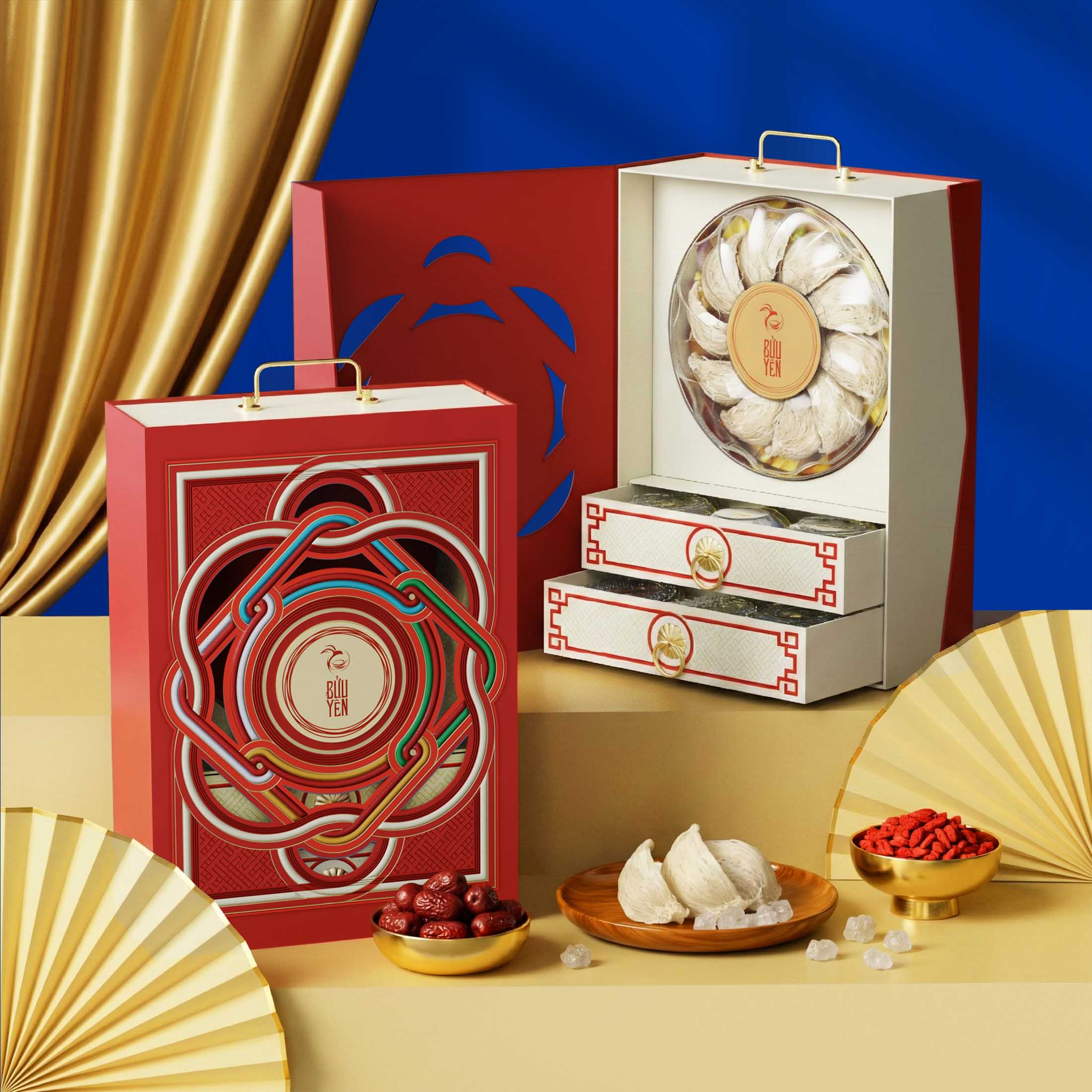 Khước từ lối mòn của những hộp quà nắp mở thông thường, combo Nhất Phẩm hiện diện đầy kiêu hãnh với dáng dấp của một chiếc tủ đứng vương giả. Kết cấu hộp được phân tầng đầy nghệ thuật, với tầng trên như một sân khấu tráng lệ tôn vinh những tổ yến thượng hạng và tầng dưới là hai ngăn kéo bí mật lưu giữ trọn vẹn bộ nguyên liệu quý.