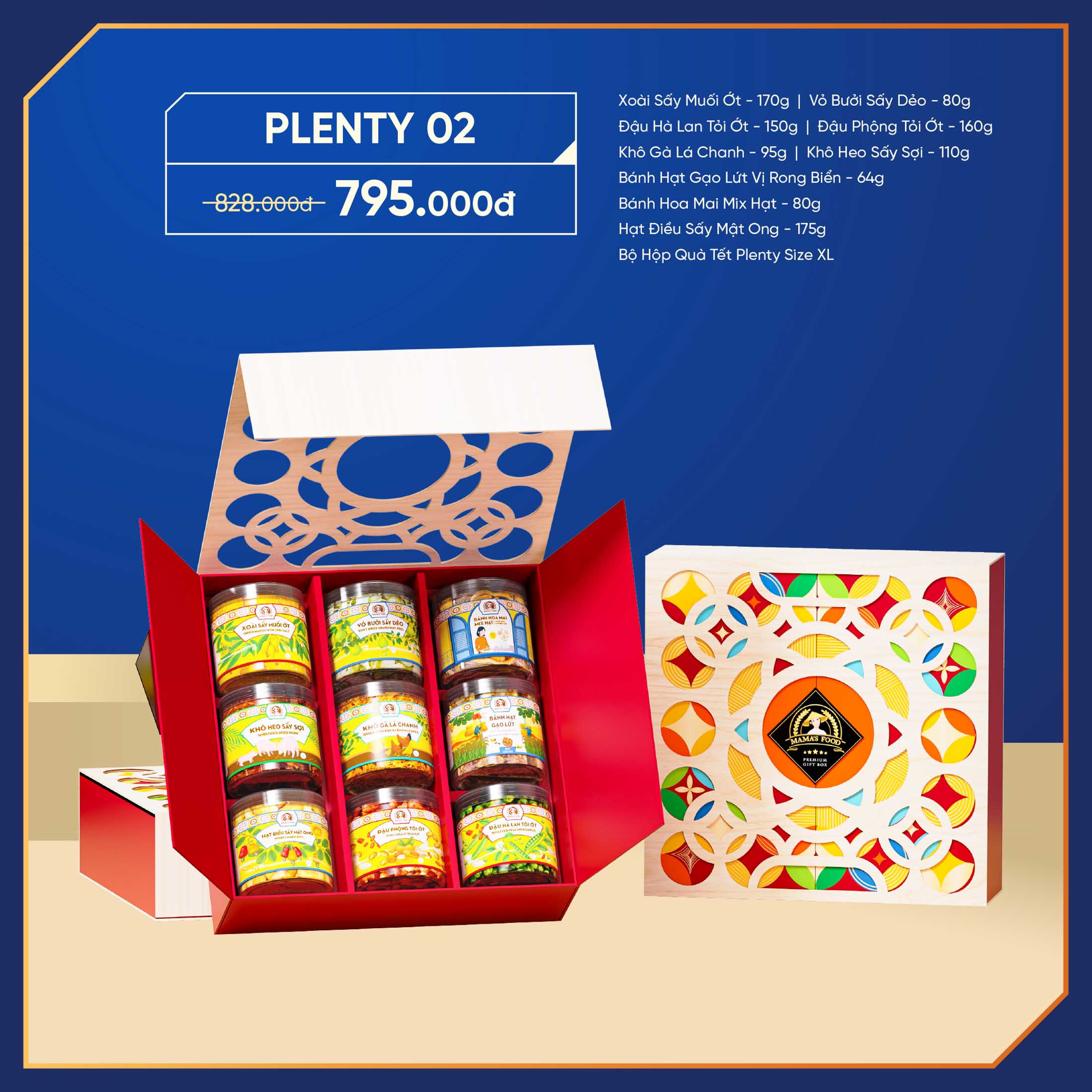 Toàn bộ sản phẩm được sắp xếp ngăn nắp trong hộp quà Tết Plenty Size XL, tạo cảm giác đầy đặn, trang trọng và dễ ghi điểm khi trao tay.