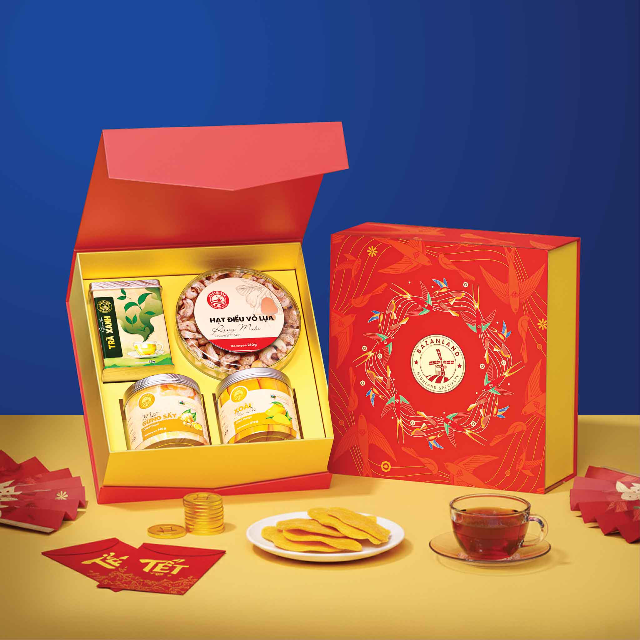 Toàn bộ sản phẩm được sắp xếp gọn gàng trong hộp quà Tết Sunrise Size Bazanland – size M. Thiết kế hộp cứng cáp với tông đỏ – vàng rực rỡ, tạo ấn tượng sang trọng ngay khi mở hộp, đồng thời thể hiện sự trân trọng và chu đáo của người tặng.