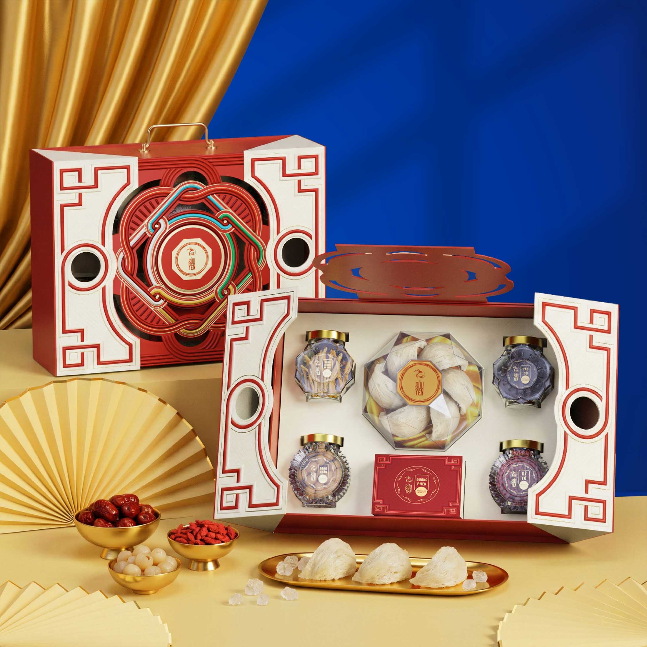 Ngay từ cái nhìn đầu tiên, Thượng Phẩm đã gây ấn tượng mạnh với tông đỏ cát tường, tượng trưng cho may mắn, cát lợi và khởi đầu hanh thông. Đi kèm là thiết kế mở cánh đối xứng gợi hình ảnh “tứ trụ” vững vàng, như một lời chúc cho sự ổn định và bền chặt trong mối quan hệ. Các đường nét tròn trịa hòa quyện với chi tiết ánh kim, tạo nên cảm giác viên mãn, trang nhã mà không phô trương.