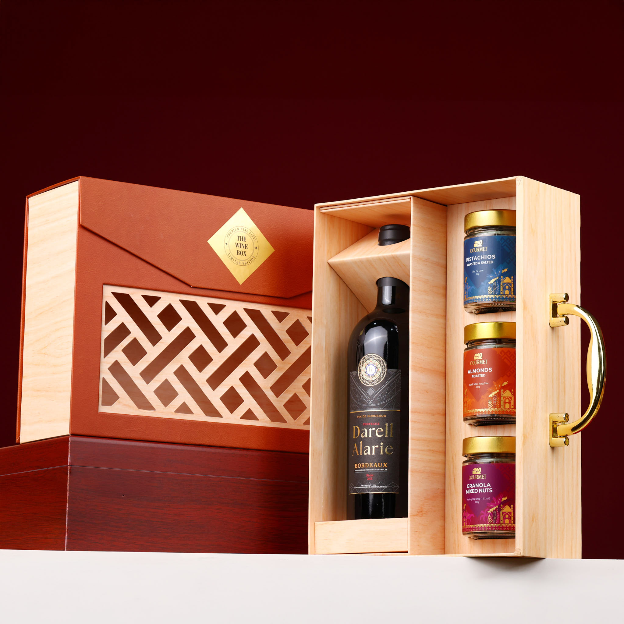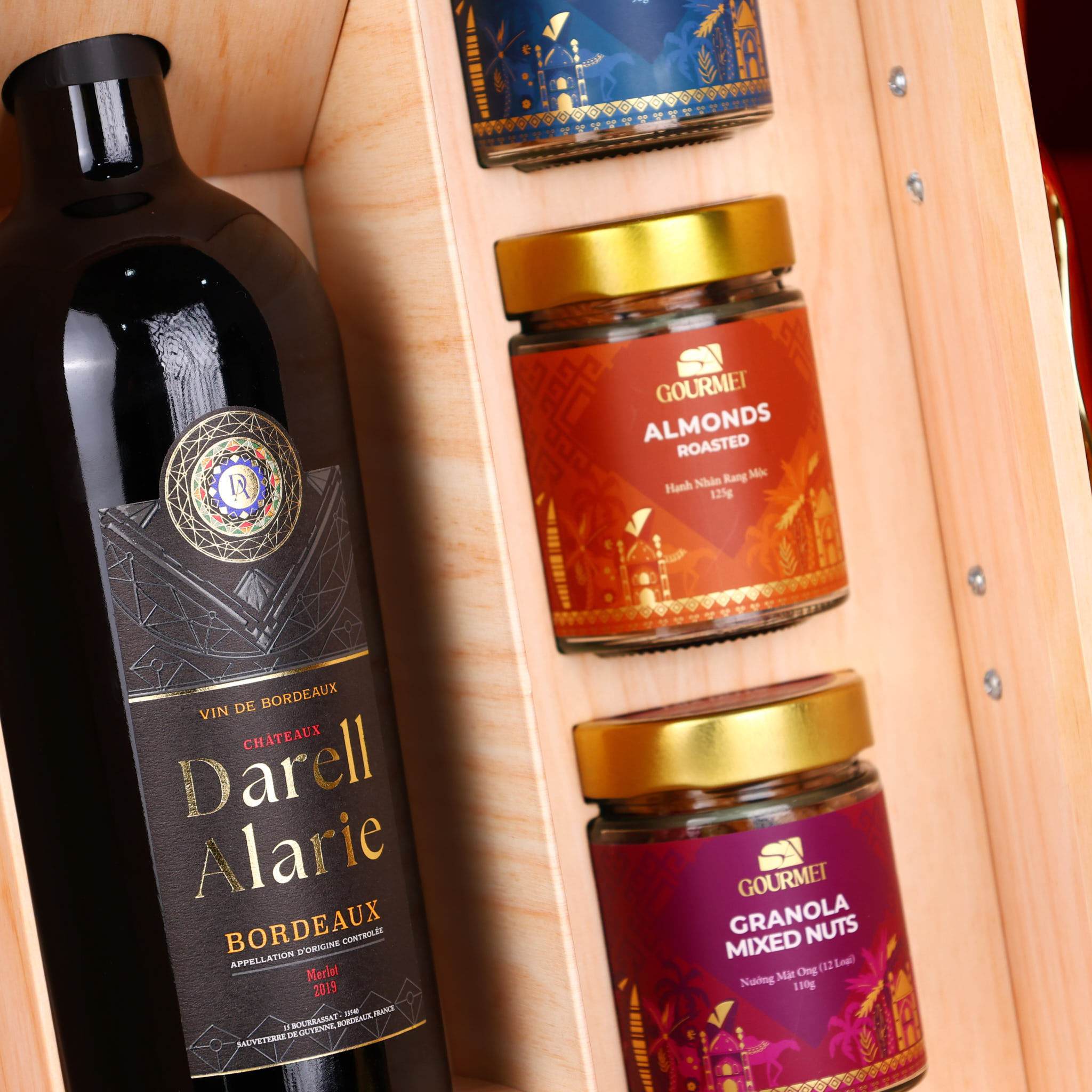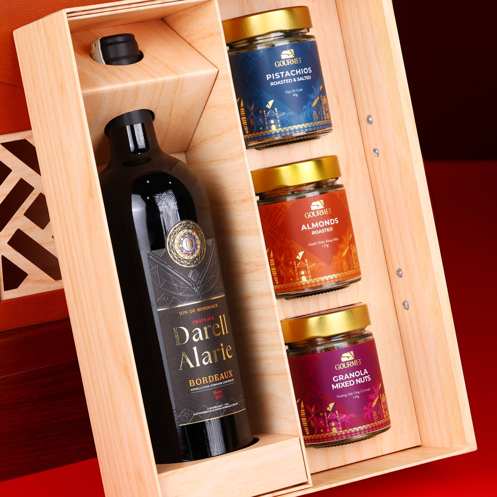Toàn bộ sản phẩm được đặt trong bộ hộp quà TWB Delicase với kết cấu chắc chắn. Phần khung màu gỗ sáng màu kết hợp cùng lớp vỏ ngoài tông nâu ánh đỏ tạo cảm giác ấm áp, sang trọng nhưng không nặng nề. Tay xách kim loại được xử lý tinh tế, giúp việc mang tặng thuận tiện và giữ form hộp đẹp trong quá trình di chuyển.