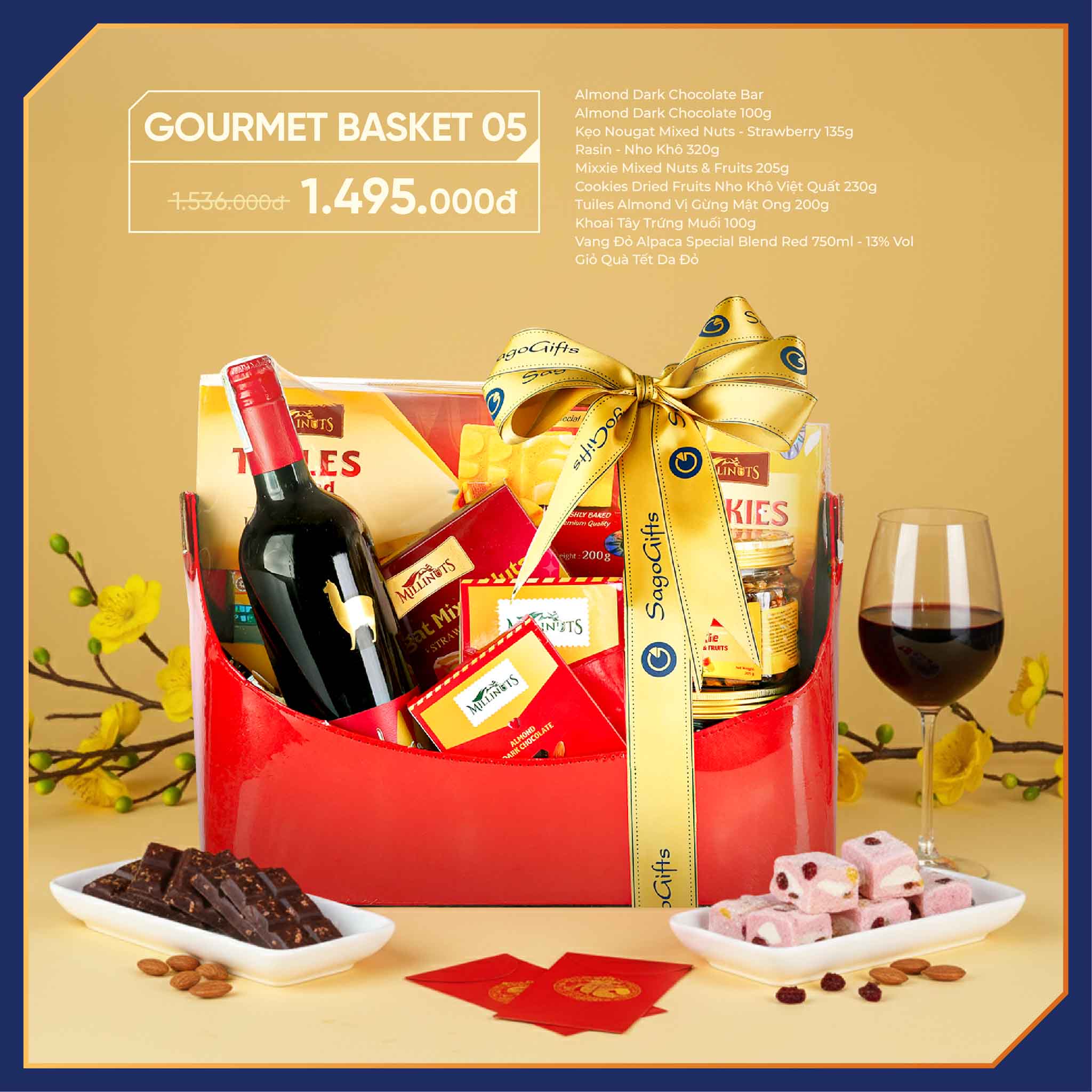 Gourmet Basket 05 quy tụ những sản phẩm được tuyển chọn kỹ lưỡng, kết hợp giữa chocolate cao cấp, bánh quy thủ công, hạt dinh dưỡng và vang đỏ nhập khẩu: