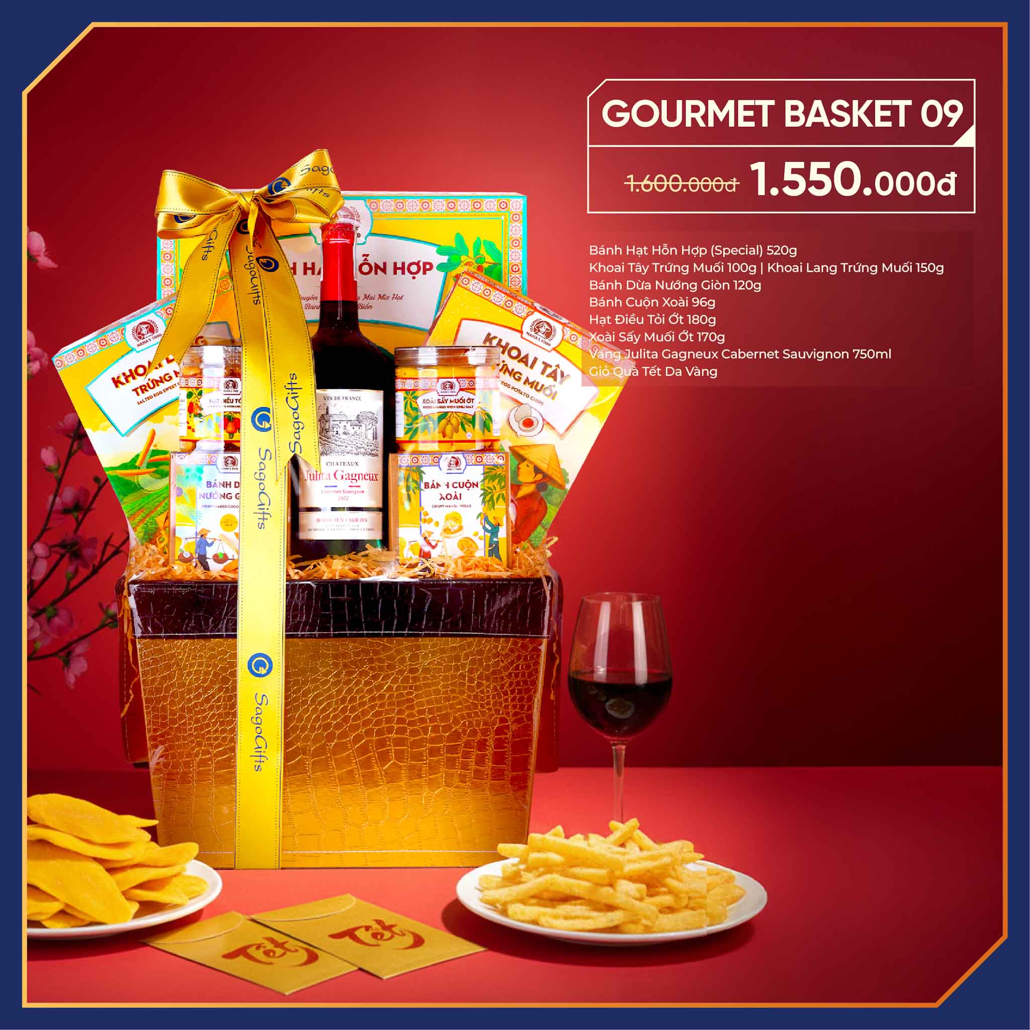Gourmet Basket 09 không chỉ là một giỏ quà Tết, mà còn là lời chúc năm mới đủ đầy, thịnh vượng và gắn kết được gửi gắm một cách tinh tế.