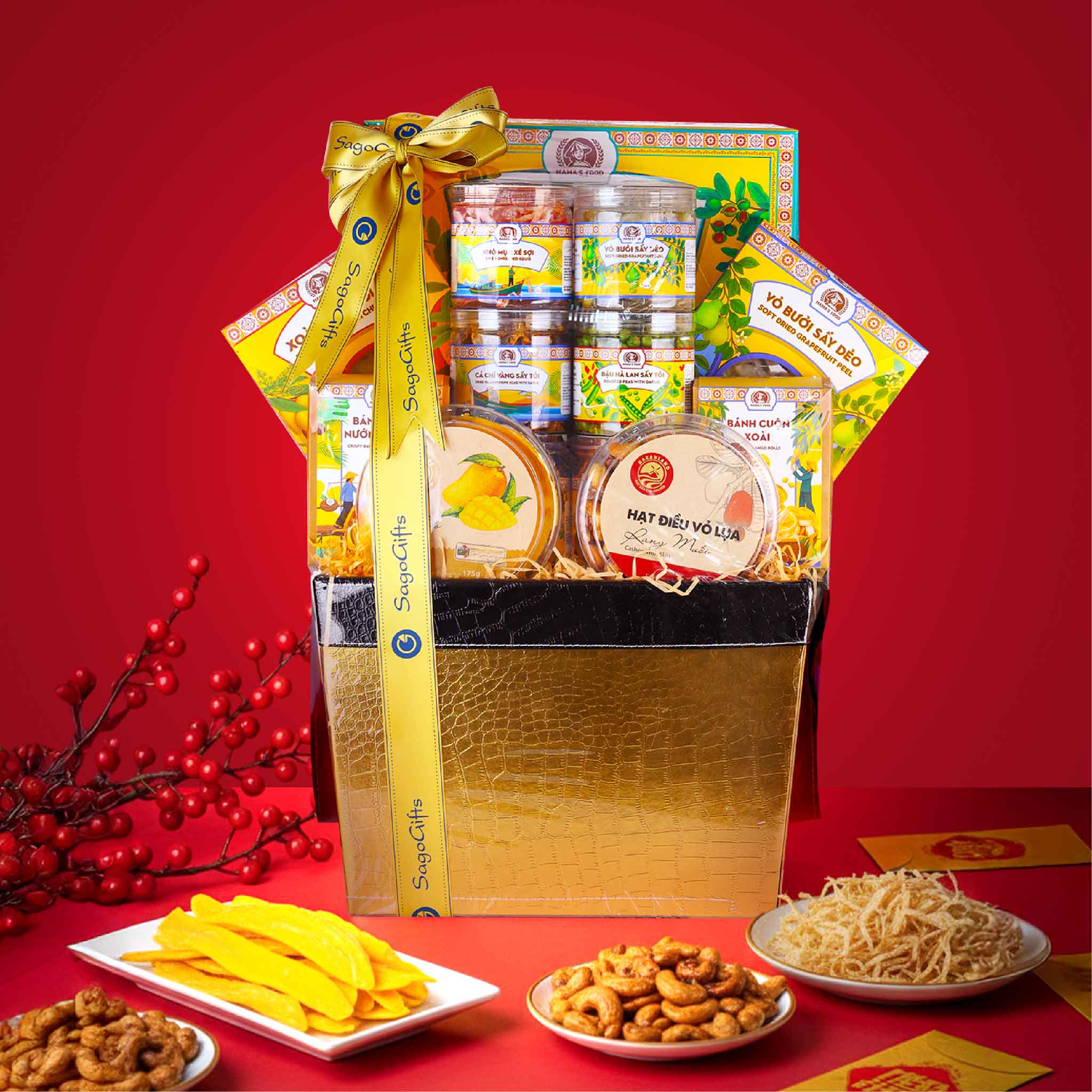Toàn bộ sản phẩm của Gourmet Basket 12 được sắp xếp trong Giỏ Quà Tết Da Vàng, một lựa chọn thiết kế mang giá trị biểu trưng trong văn hóa Á Đông. Màu vàng từ lâu đã đại diện cho tài lộc, phú quý và sự hanh thông, là gam màu rất được ưa chuộng trong các món quà Tết.