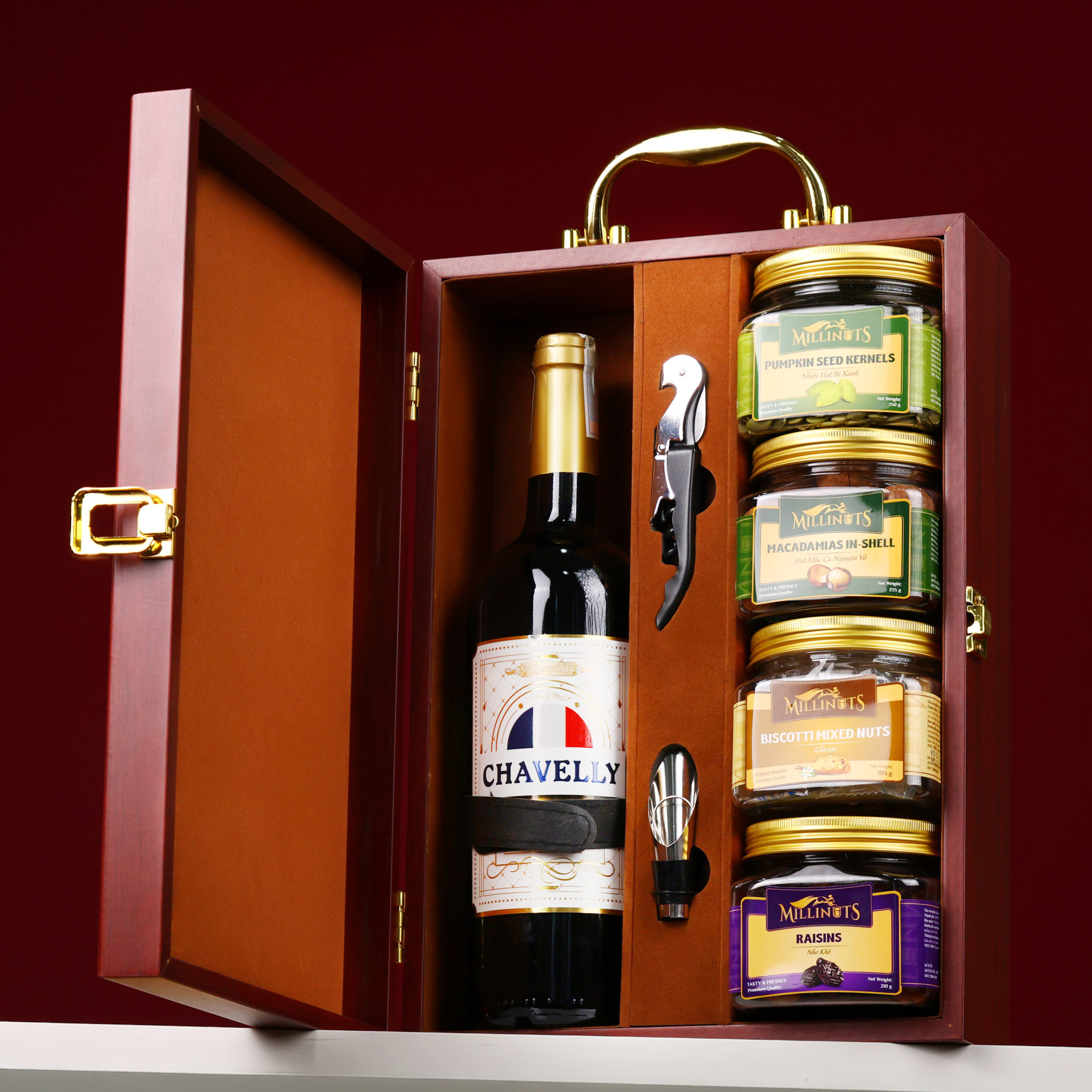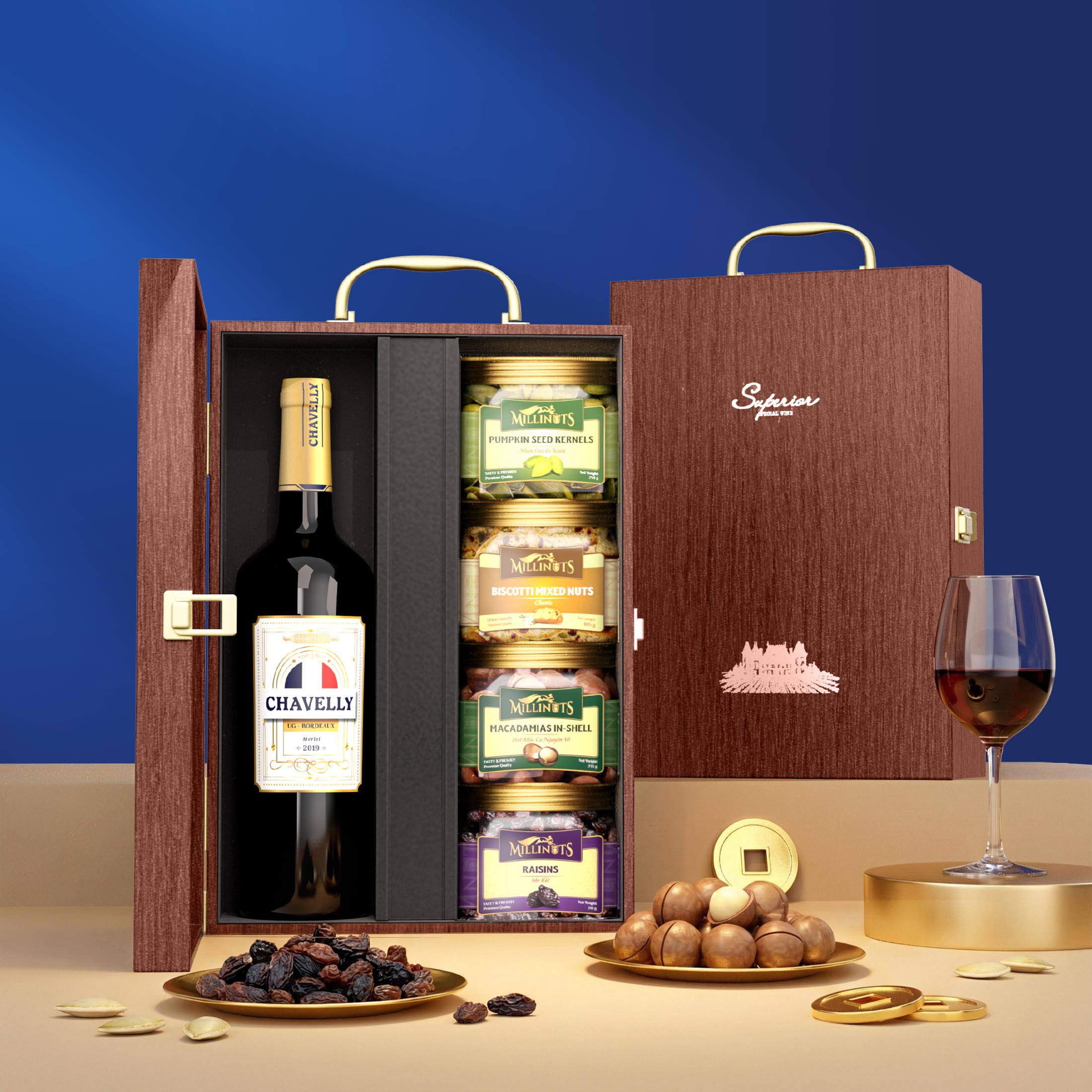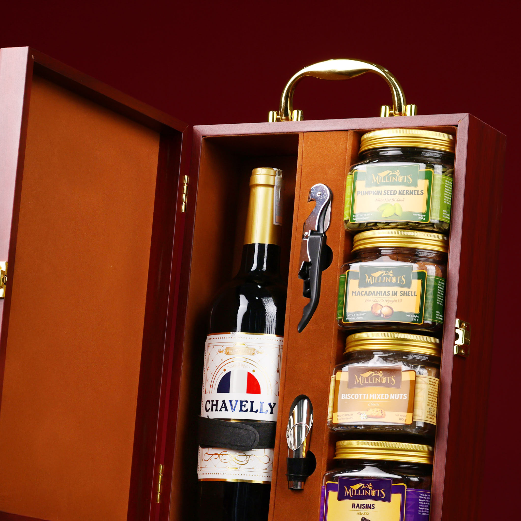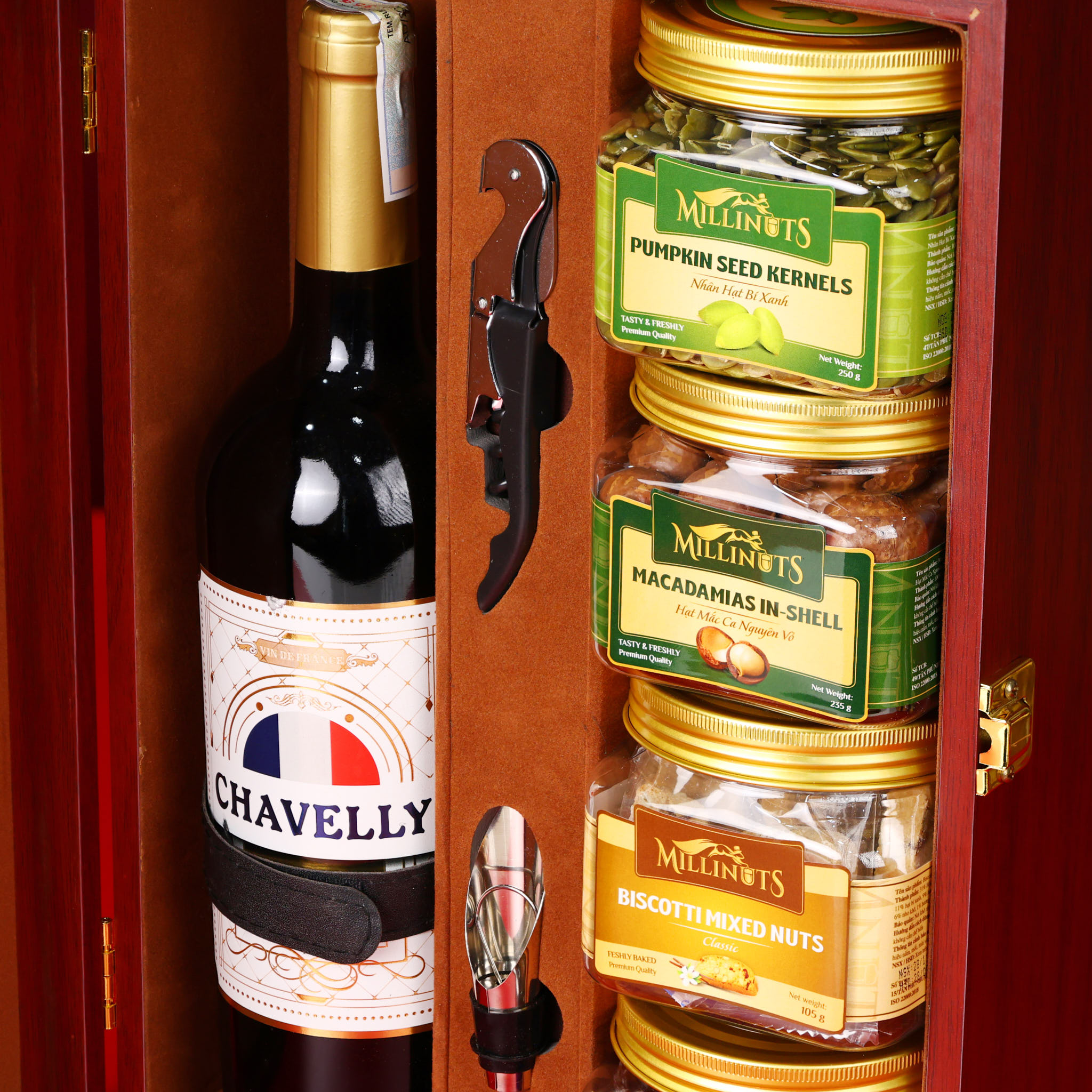 - Rượu Vang Chavelly Merlot 750ml: Dòng vang đỏ từ giống nho Merlot nổi tiếng với hương vị êm dịu, đằm thắm và màu sắc quyến rũ. Rượu vang đỏ là linh hồn của bữa tiệc, tượng trưng cho vận may, tài lộc và sự gắn kết bền chặt giữa người tặng và người nhận.