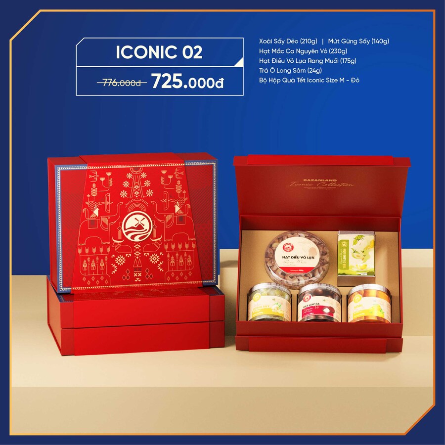 Toàn bộ các thức quà được sắp xếp gọn gàng, thẩm mỹ trong hộp quà Tết Iconic Size M – màu đỏ. Sắc đỏ sang trọng không chỉ nổi bật về mặt thị giác mà còn tượng trưng cho may mắn, hỷ khí và khởi đầu hanh thông trong năm mới.