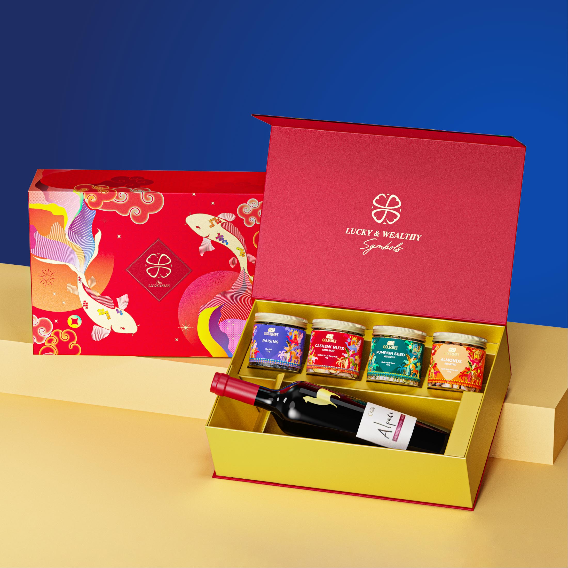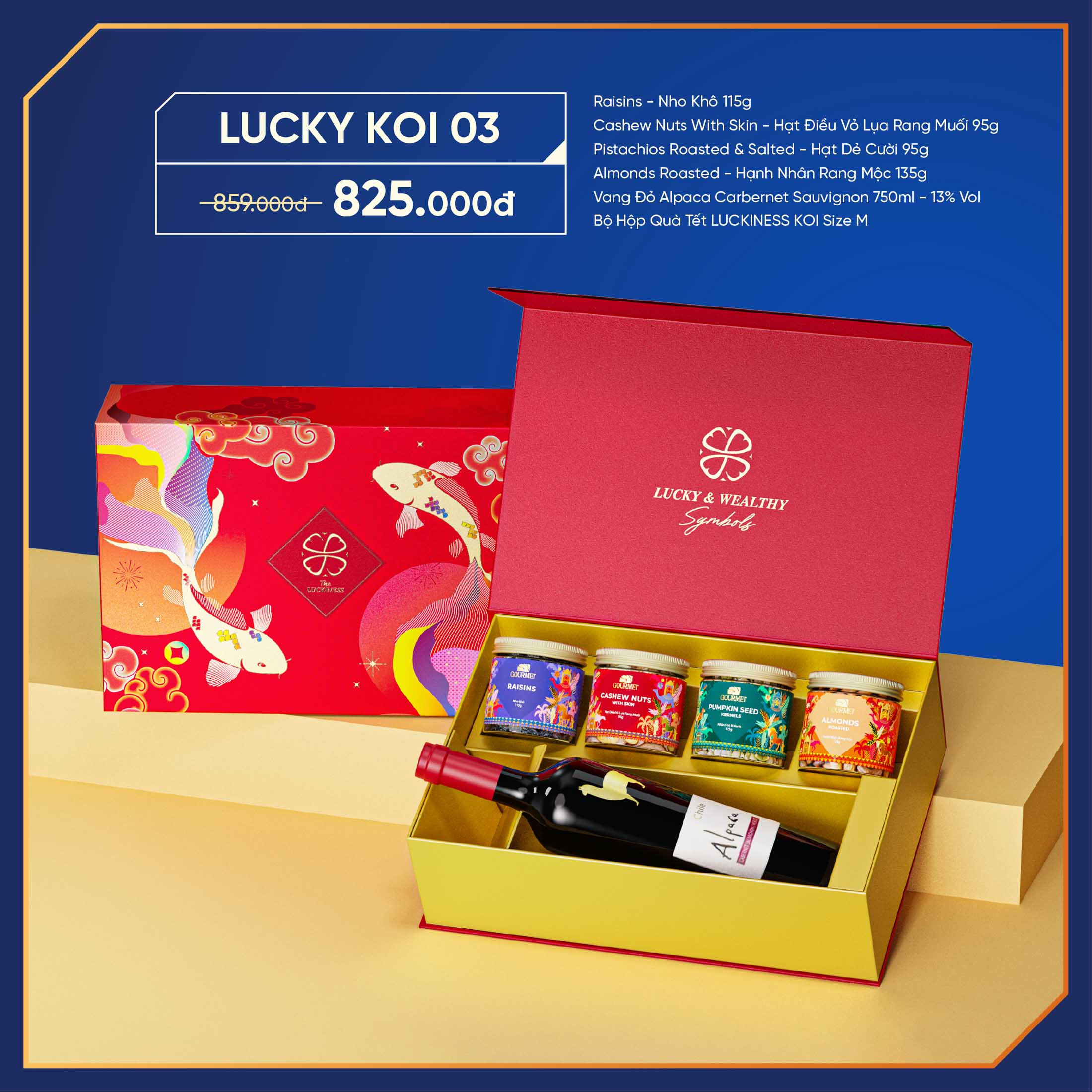 Tất cả được sắp xếp tỉ mỉ trong hộp Luckiness Koi size L, tone màu tinh tế, thiết kế hiện đại mà vẫn gợi nhớ không khí Tết truyền thống, tạo cảm giác trang trọng ngay khi mở hộp.
